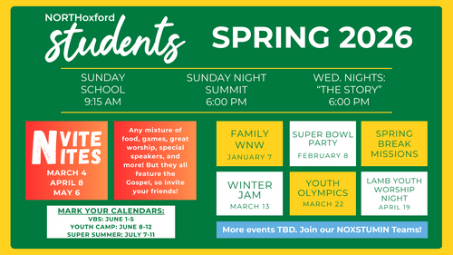 The purpose of the Student Ministry at North Oxford is to fulfill the Great Commission by leading students to be faithful followers of Christ and supporting parents in their role as primary disciple-makers of their home. Our goal is to allow students to GATHER with believers, GROW in their faith through discipleship groups, and GO on mission to share God’s love with others.